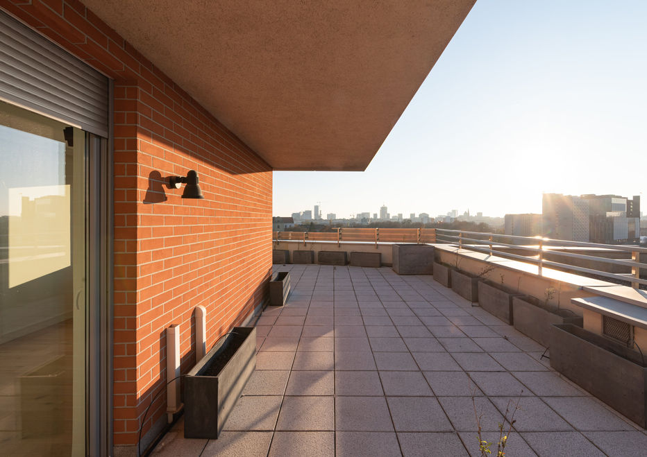 Z każdego pokoju oraz z kuchni można wyjść na taras – imponujący, niestandardowy, okalający całe mieszkanie. Z jednej strony rozciąga się widok na bujną zieleń parku, z drugiej – na panoramę Poznania. Taras wyposażono w donice z automatycznym systemem nawadniania – idealne do stworzenia własnej miejskiej oazy.
