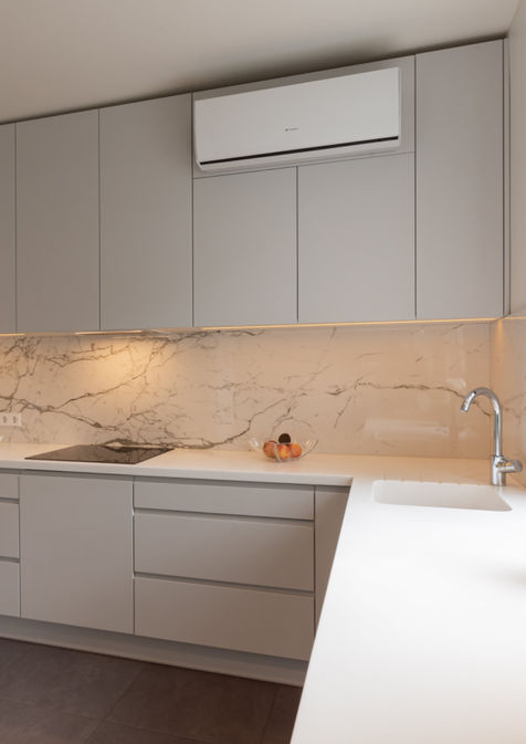 Wyposażenie obejmuje sprzęty: Siemens, Bosch, Electrolux, Amica, blat z kompozytu oraz spiek kwarcowy. Wygodna i ponadczasowa przestrzeń do gotowania.