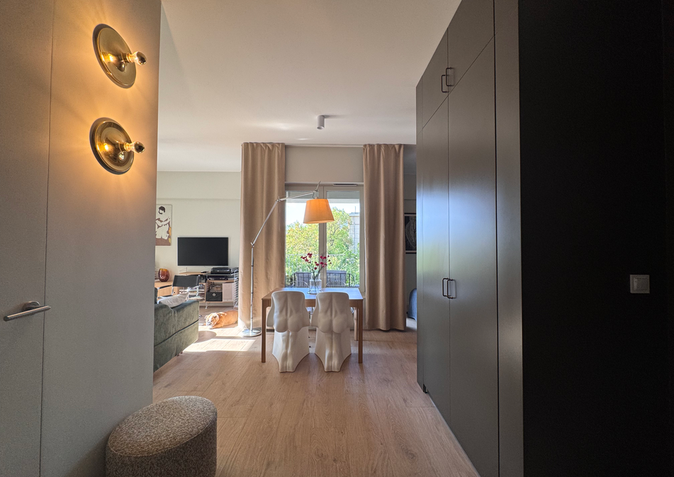Duże, drewniane okna zapewniają dostęp do naturalnego światła przez większość dnia, a przemyślany układ sprawia, że przestrzeń mieszkania jest bardzo efektywnie zagospodarowana. Mieszkanie wyposażono w jednostki klimatyzacji DAIKIN oraz wideodomofon, zapewniając tym samym komfort mieszkańcom.
