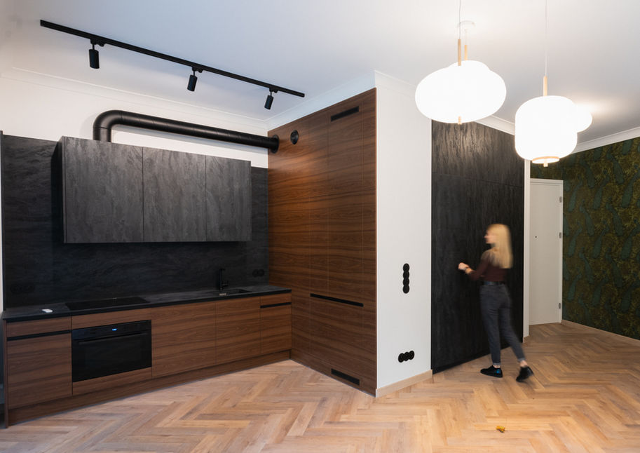 Kuchnia wg indywidualnego projektu wyposażona w: zmywarkę, piekarnik, lodówkę, płytę grzewczą oraz pochłaniacz.