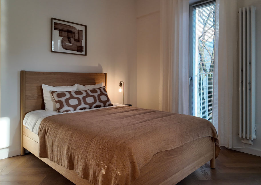 Sypialnia to oaza ciszy – z wygodnym, drewnianym łóżkiem, naturalną pościelą i delikatną