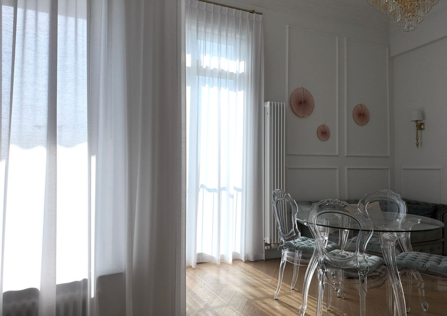 jasny salon z dużymi oknami, ozdobnymi sztukateriami i wyjściem na loggię