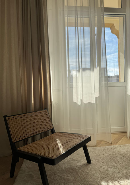 Mieszkanie utrzymane jest w jasnej kolorystyce. Przepiękna podłoga ułożona w klasyczną jodełkę oraz stylowe dodatki — lampy, dywan, długie zasłony — tworzą przytulny, kameralny klimat. Wnętrze jest spójne i starannie zaprojektowane.